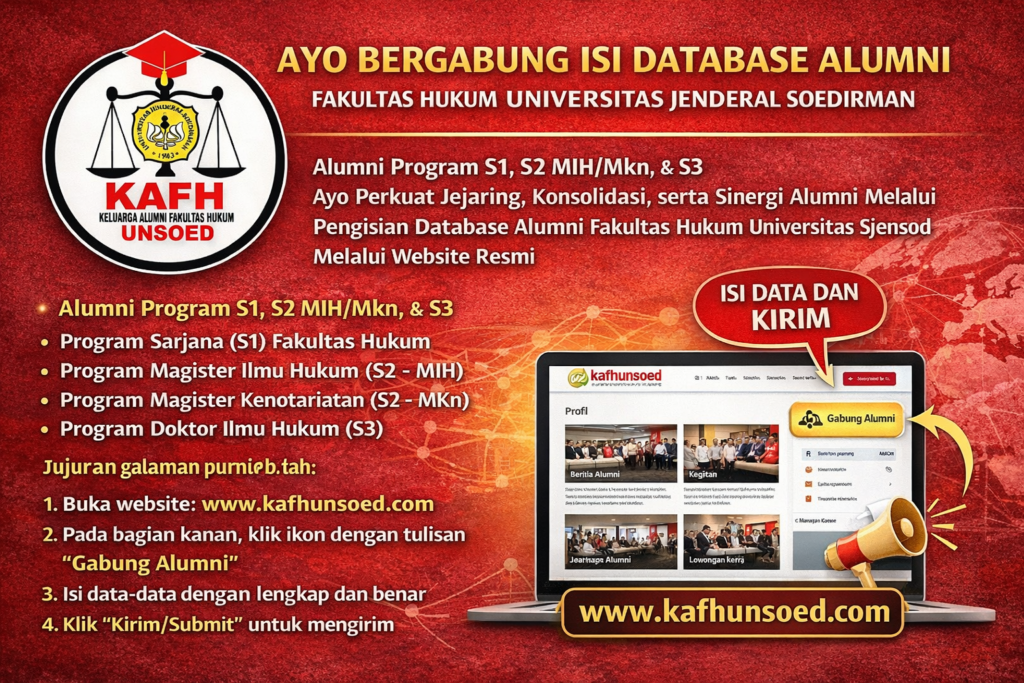 Dalam rangka memperkuat jejaring, konsolidasi, serta sinergi antar alumni lintas angkatan dan lintas program studi, Keluarga Alumni Fakultas Hukum Universitas Jenderal Soedirman (KAFH Unsoed) mengajak seluruh alumni untuk bergabung dan mengisi database alumni melalui website resmi www.kafhunsoed.com.